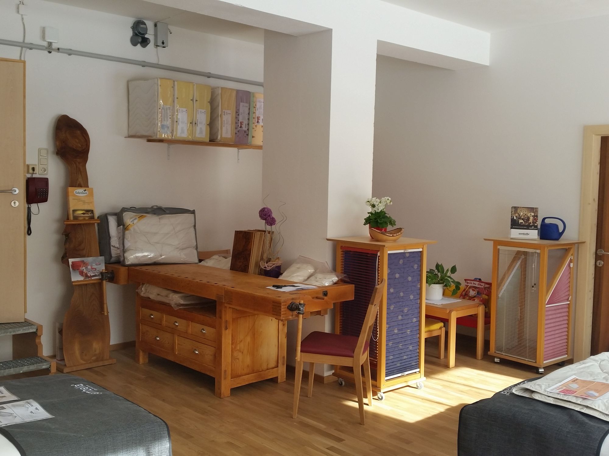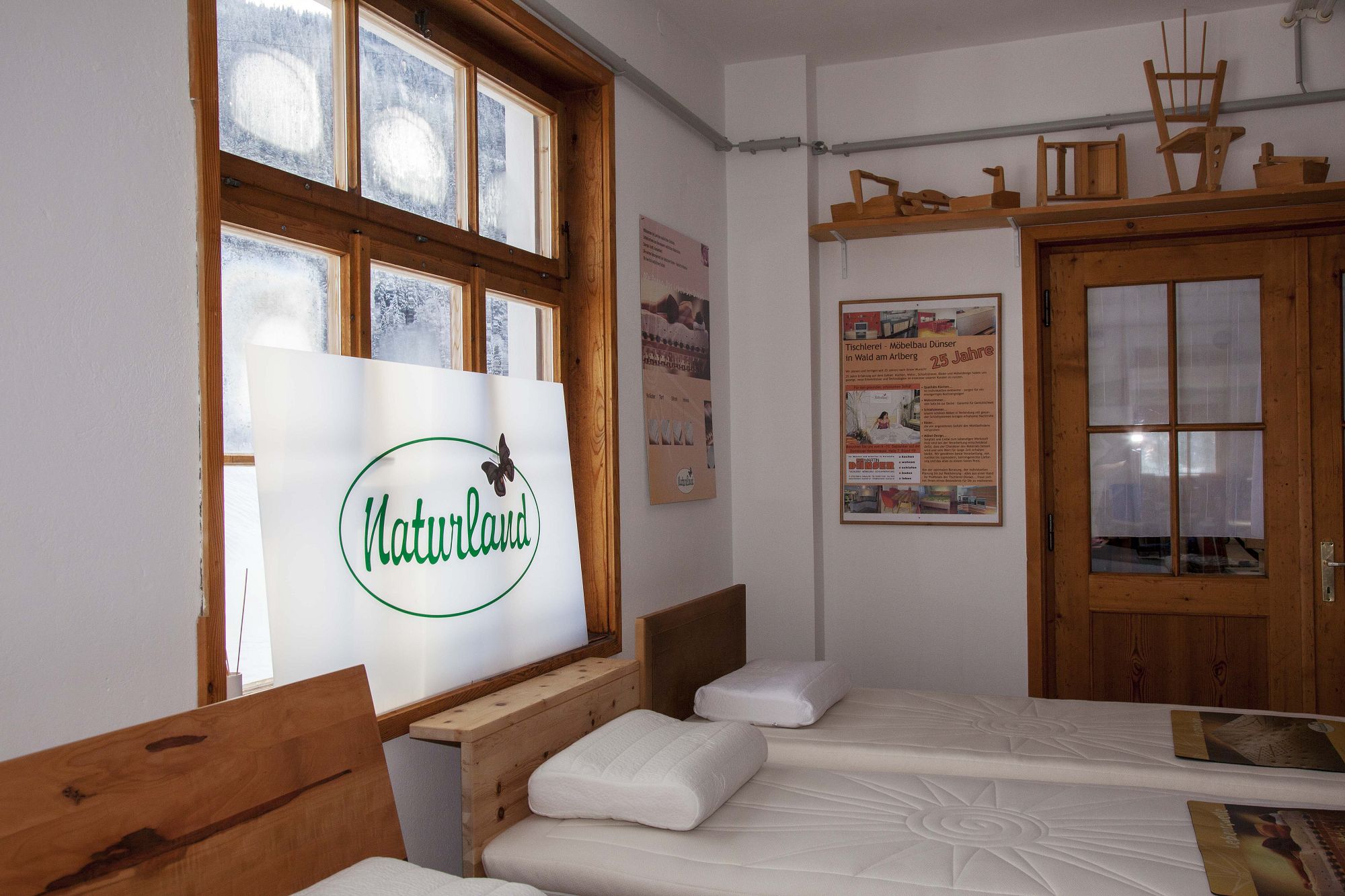 Was man sieht und angreifen kann, das kann man sich besser vorstellen und lässt sich besser erklären. Deshalb hat Martin Dünser einen Schauraum in Wald am Arlberg eingerichtet. Im Erdgeschoss neben seinem Büro, auf vierzig Quadratmetern, sind unterschiedliche Bettsysteme in verschiedenen Holzarten ausgestellt; zum Beispiel: Zirbe, Fichte, Birne, Lärche. Ebenso können innovative Lattenrost-Systeme und Matratzen getestet werden.